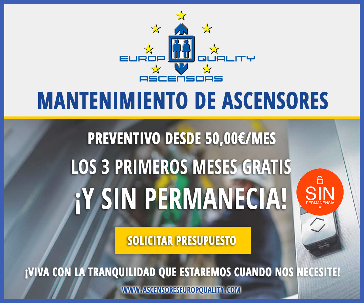 Ofrecemos mantenimiento preventivo desde 50,00€/mes o todo riesgo desde 99,00€/mes, con la posibilidad de probar nuestro servicio durante 3 meses sin pagar ni un céntimo. Si no te encuentras conforme con Ascensores Europ Quality cancelamos tu contrato sin penalización alguna. Es asi de simple, sólo estarás con nosotros el tiempo que tu elijas. ¡Nuestro mantenimiento de ascensores no exige permanencia!